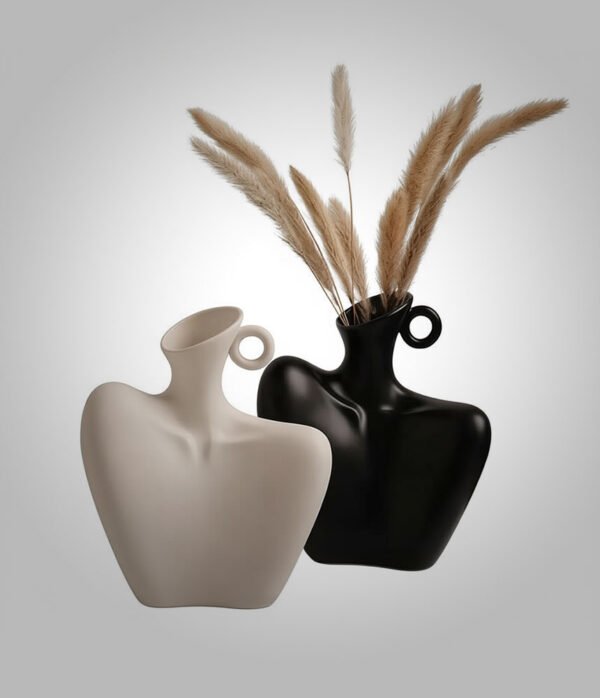 Crafted from premium ceramic, each vase features a unique, abstract silhouette inspired by natural curves, complete with a distinctive circular handle that adds a touch of artistic flair. The matte black and soft white finishes offer versatile styling options, effortlessly complementing neutral palettes, Scandinavian interiors, or bold modern decor.