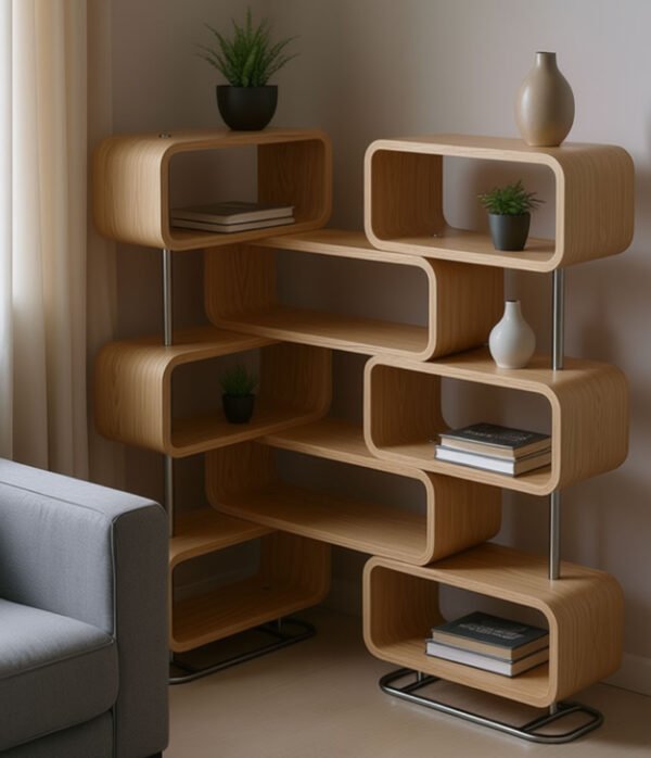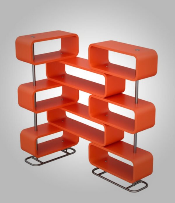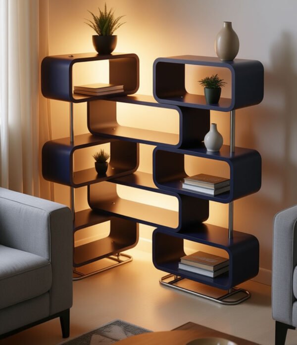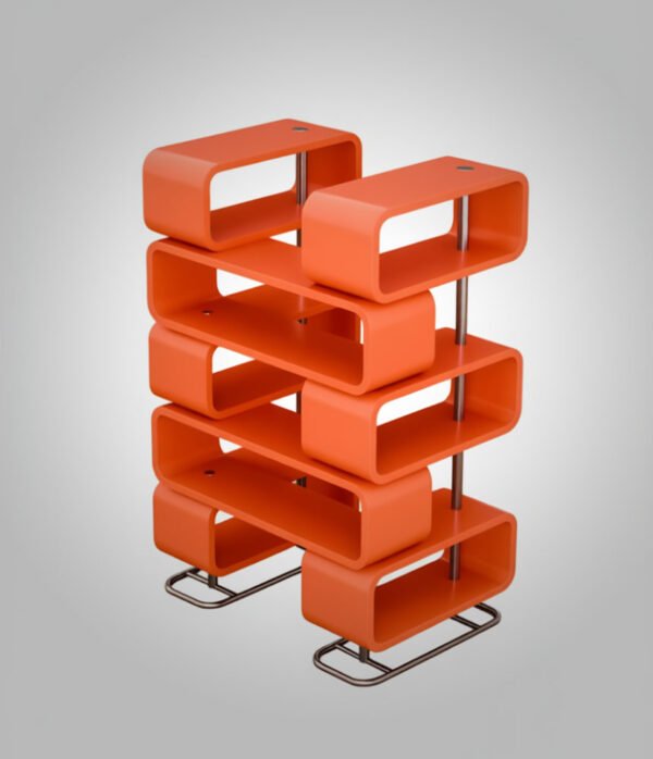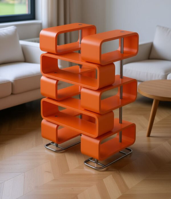 Premium Quality & Modern Style: Crafted from high-quality materials with a smooth, durable finish, this bookshelf features a striking geometric design with rounded edges for a soft, modern look. The sturdy chrome-finished metal legs provide stability and a touch of industrial chic, complementing both minimalist and eclectic interiors. Available in vibrant Orange, sophisticated Navy Blue, and warm Natural Wood tones to match any Egyptian home’s color scheme.